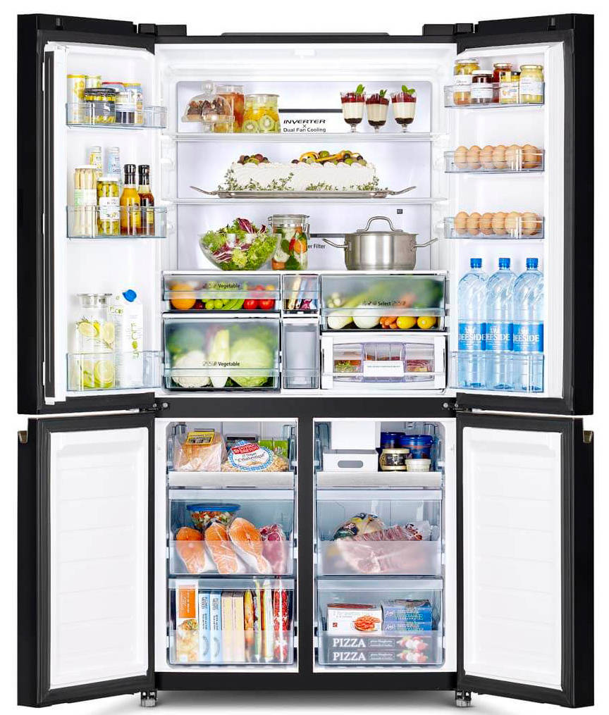 Hitachi R‑WB720VUC0 (GBK) — трёхкамерный четырёхдверный холодильник Side‑by‑Side с фронтальной панелью из чёрного стекла. Модель сочетает большой объём (568 л), инверторный компрессор, систему No Frost и передовые технологии Hitachi для максимальной свежести продуктов.