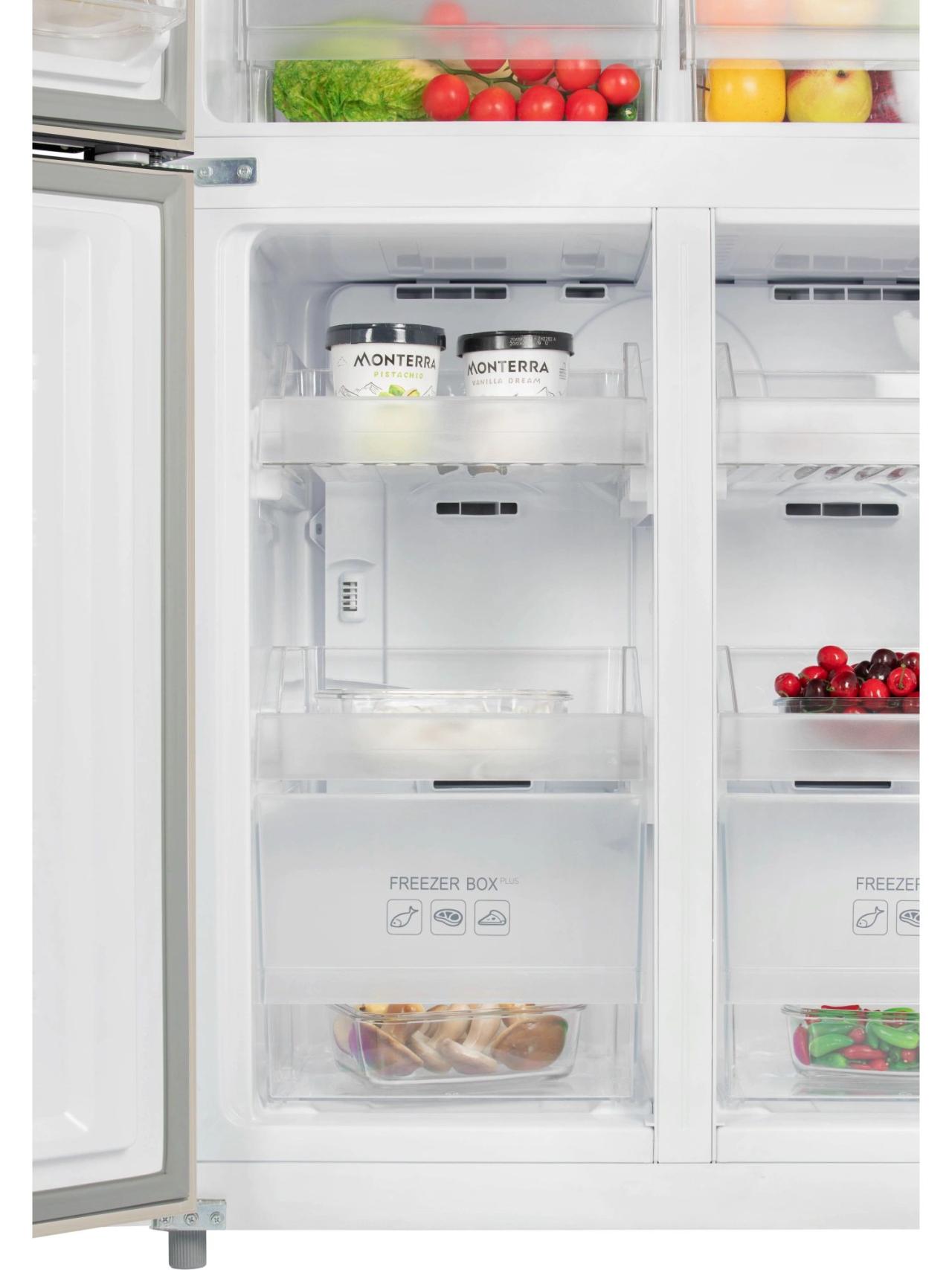 4-х дверный холодильник имеет единое пространство верхних полок холодильной камеры, чтобы удобно было размещать габаритные кастрюли и контейнеры. Прочные полки из закаленного стекла можно регулировать по высоте, а ящики в холодильной камере предназначены для хранения овощей и фруктов и оснащены влажной зоной свежести и сухой.