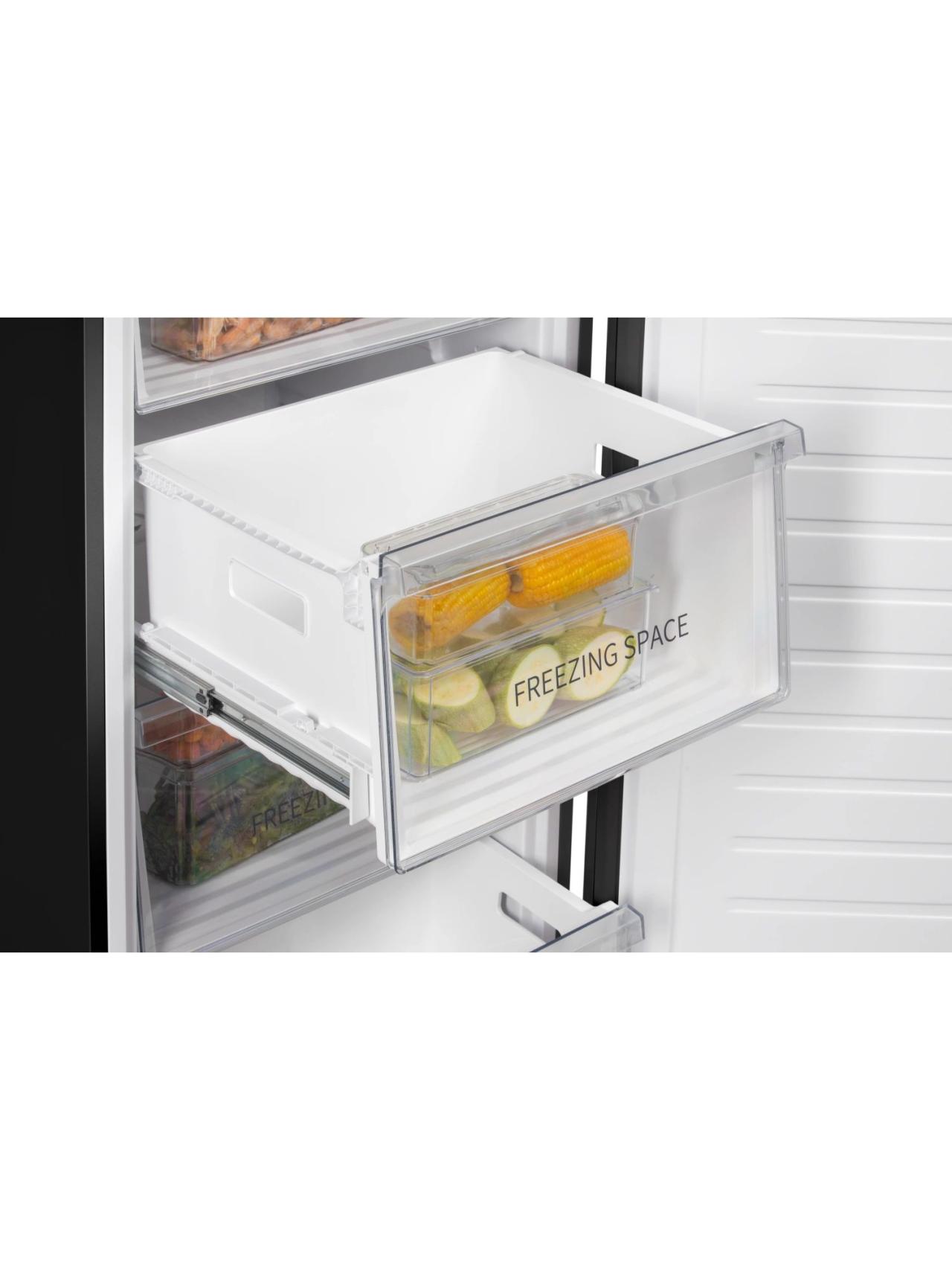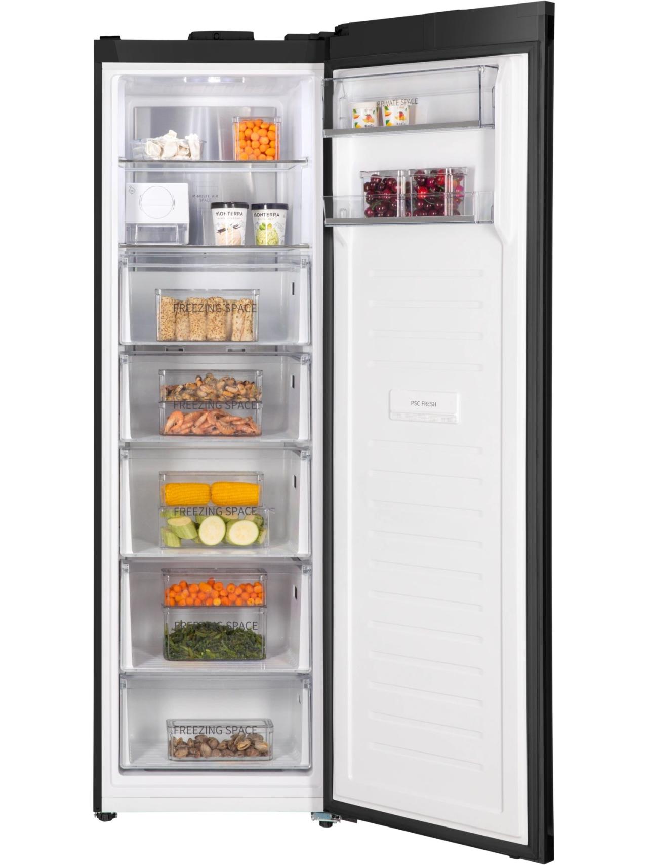 Общий объем морозильника составляет 336 литров. Система охлаждения работает на двух хладагентах – R600a и R290, что обеспечивает глубокую заморозку большого объема продуктов за короткое время с сохранением их пользы и вкусовых свойств. Мощность замораживания — до 20 кг в сутки. В случае отключения электроэнергии морозильник может автономно сохранять холод до 10 часов.