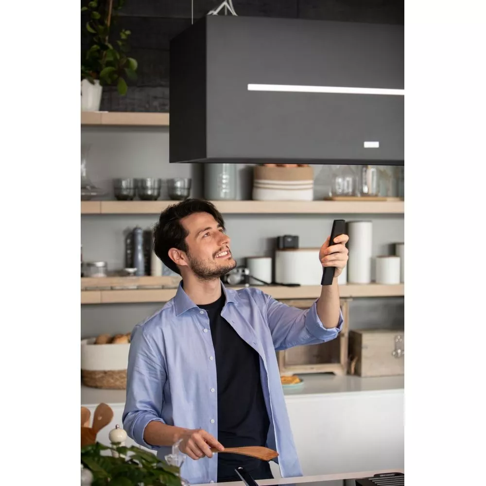 Островная кухонная вытяжка Franke FMAS BK EXTRA MATT F80 KL — выбор для тех, кто ценит чистый воздух и аккуратный дизайн. Черный матовый корпус органично вписывается в современные кухни и не отвлекает от общего интерьера, а фоновая подсветка из LED-лент по бокам создает уютную атмосферу и подчеркивает зону готовки.