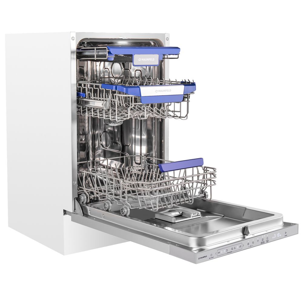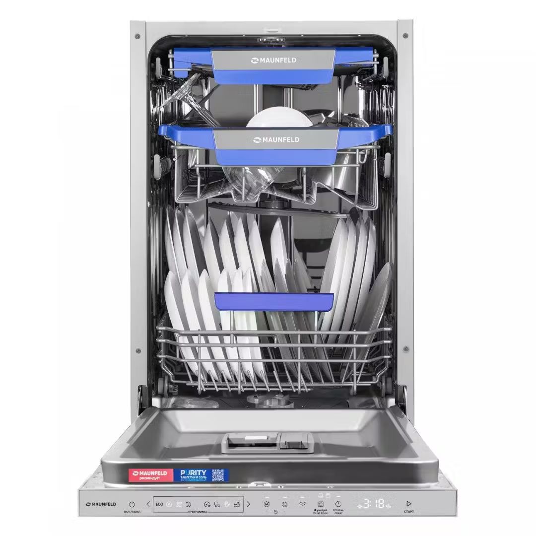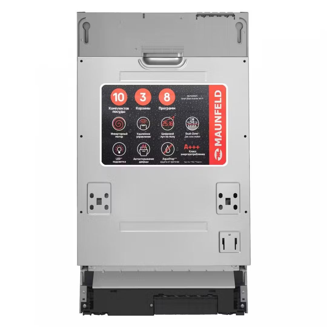 Встраиваемая посудомоечная машина MAUNFELD MLP45330T Smart Beam Inverter Wi-Fi — узкая, но вместительная модель шириной 45 см (вместо классических 60 см). За раз она может вымыть до 10 комплектов посуды, что оценят в больших семьях, а также те, кто любит готовить и часто принимает гостей.
