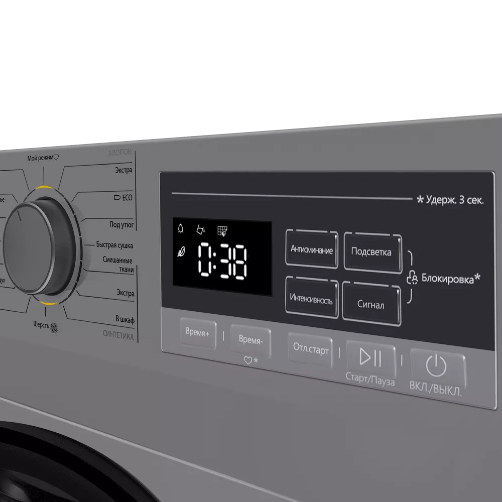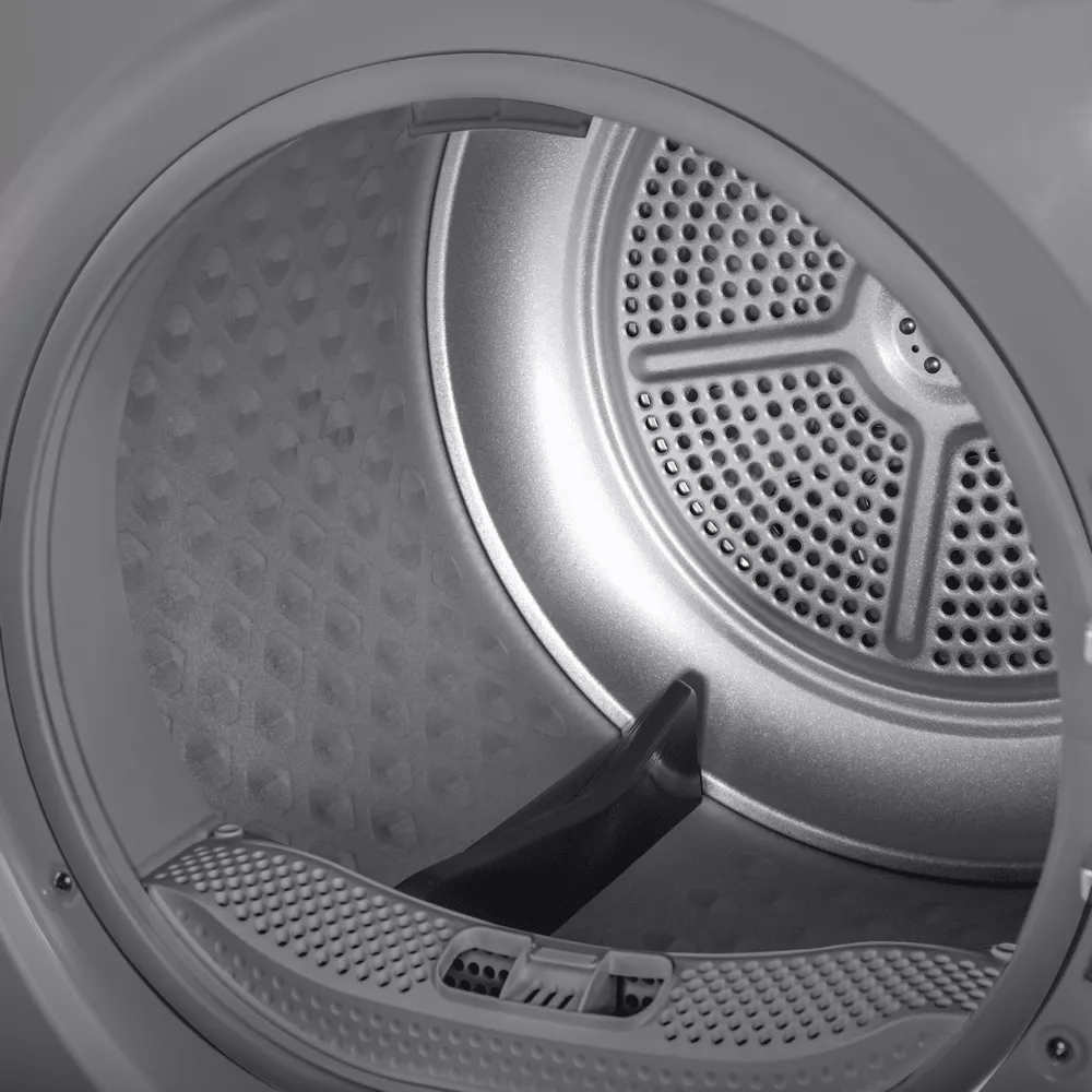 Загрузка до 8 кг и внушительный объём барабана дают возможность сушить большие партии белья за один раз. Режим «Антисмятие» предотвращает образование складок, а внутренняя подсветка упрощает загрузку и выгрузку вещей.