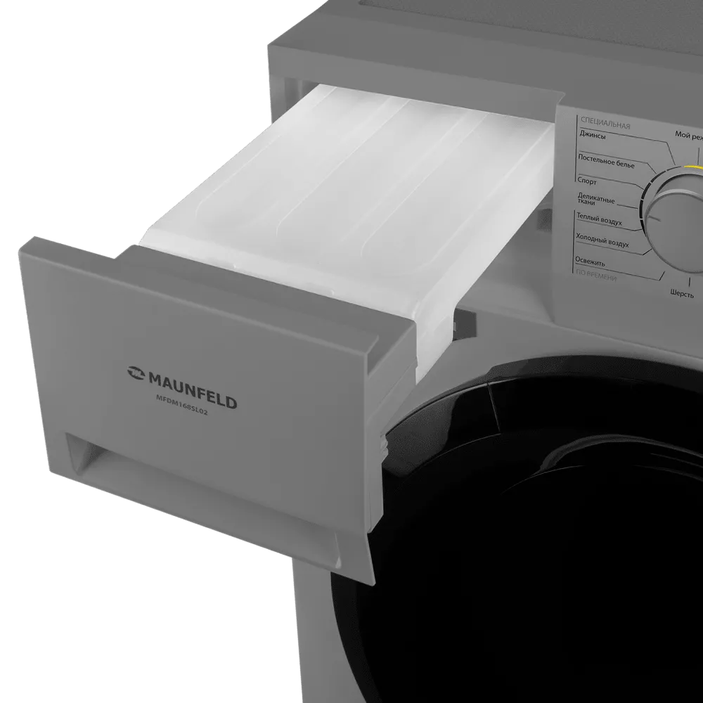 Сушильная машина с тепловым насосом MAUNFELD MFDM168SL02 экономит энергию за счёт рециркуляции тепла и бережно сушит бельё при щадящих 50–60°C. Это решение не требует вентиляции или слива — работает автономно в любом помещении, оставаясь удобным и универсальным в установке.