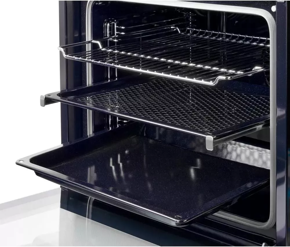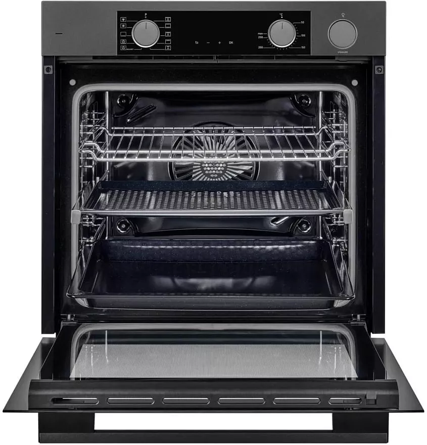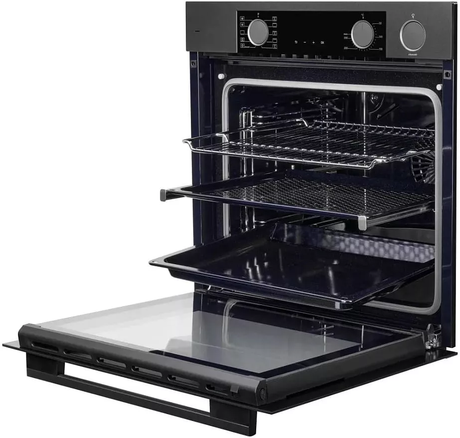 Модель оборудована цифровым дисплеем с индикатором времени приготовления, таймером и звуковым сигналом, который оповестит об окончании программы. Предусмотрено наличие светодиодного освещения внутри духовки. Дополнительно в комплект прилагаются решетка для гриля и глубокий противень.