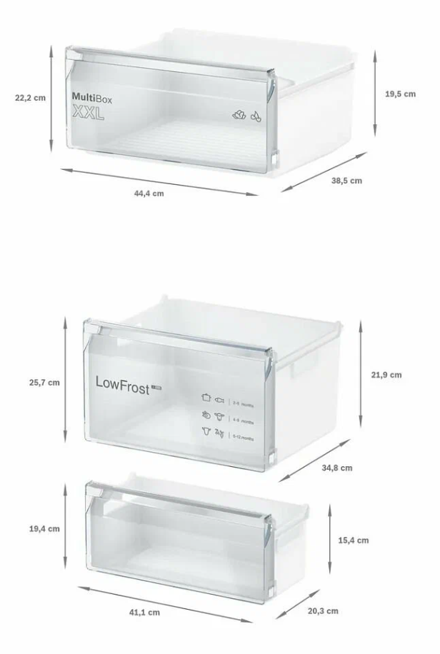 • Контейнеры для свежести: MultiBox для овощей/фруктов в холодильнике и BigBox для крупных продуктов в морозилке.