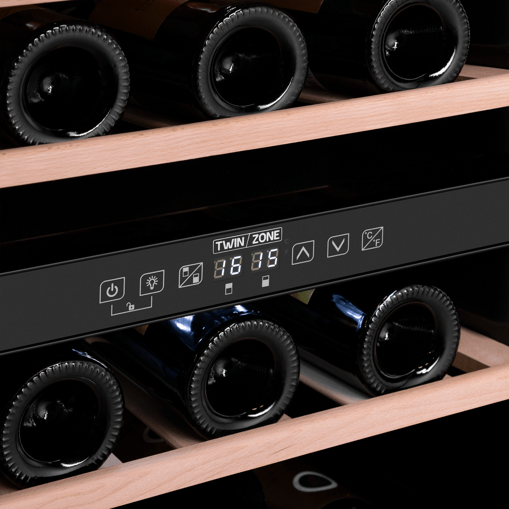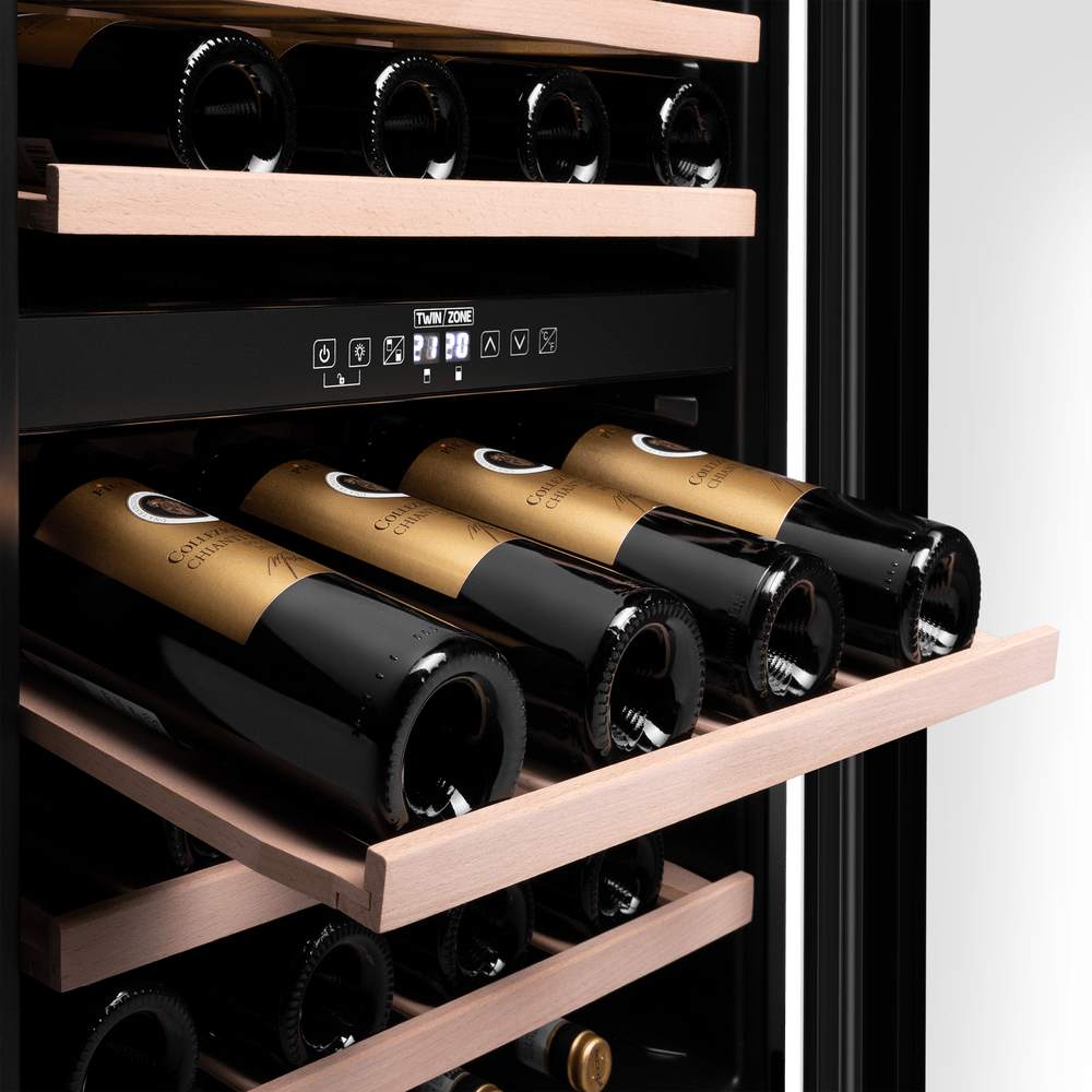 Элегантный корпус из черного металла и стеклянная дверца с защитой от УФ-лучей гармонично сочетают стиль и практичность. Внутреннее пространство организовано с помощью 5 деревянных полок из массива бука, что обеспечивает правильное хранение бутылок и минимизирует вибрации.